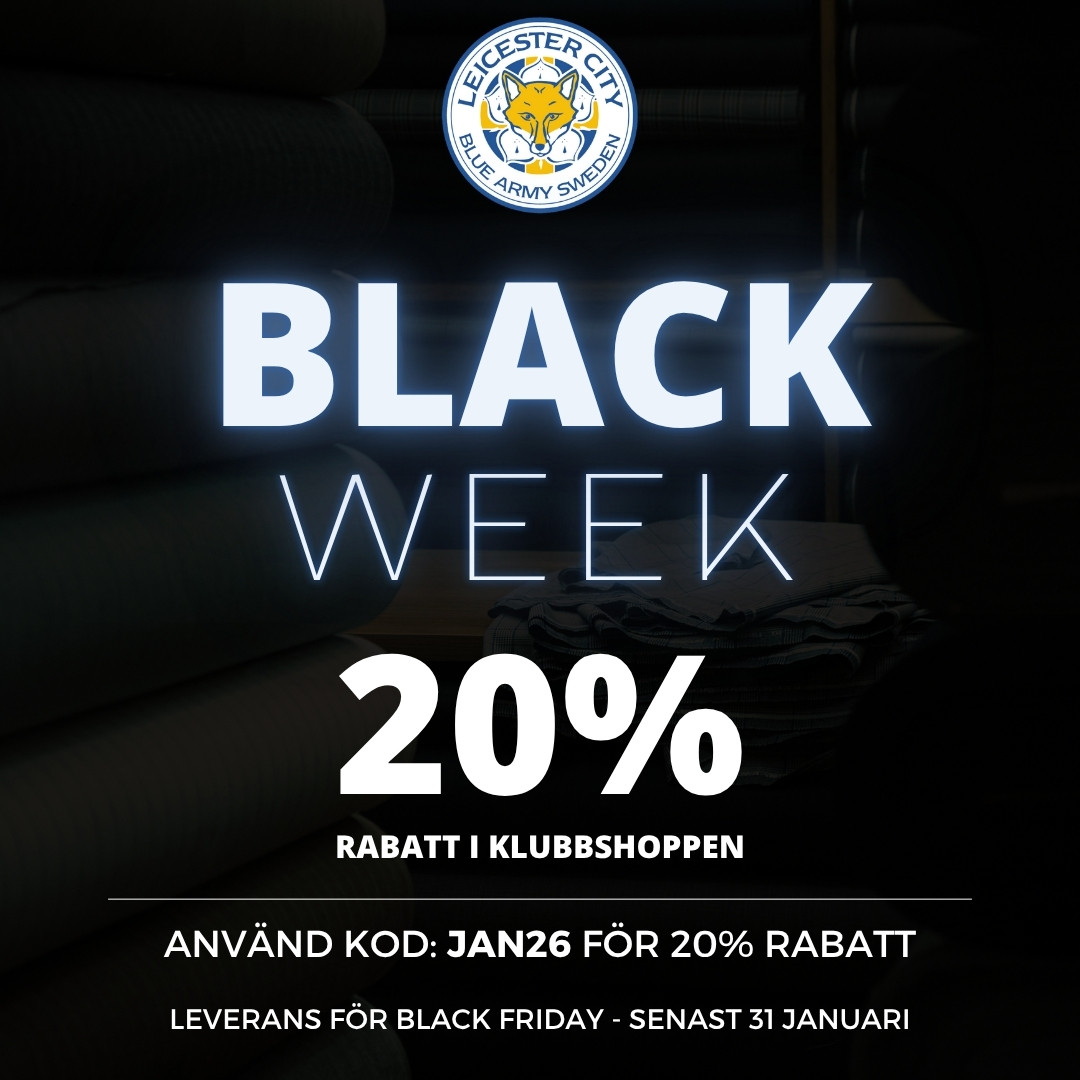 Nu är det snart dags för Black Week och årets erbjudande kommer att vara 20% i vår klubbshop. Kampanjen kommer att gälla under ca 10 dagar. Mellan torsdag den 27 november - söndag 7 december. Kampanjen kommer alltså att ge 20% rabatt på allt i klubbshoppen, men med längre leveranstid. Leverans för alla som använder rabattkoden JAN26, kommer att vara senast 31 januari.