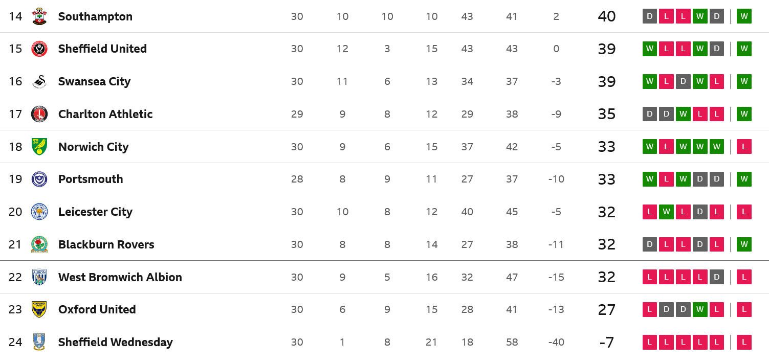 Enligt rykten kommer Leicester City att gå till högre domstol för att överklaga detta beslut, som de anser rent lagvidrigt. Vi har nog inte hört det sista i denna affär, men för nu ser Championshiptabellen ut så här:
